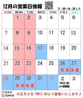12月の営業日情報をお知らせ致します。 ・17日(水)臨時休業 ・26日~1/1年末年始休暇 正月は2日・12時から営業します