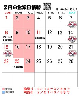 2月の営業日情報をお知らせ致します。 ご確認の程宜しくお願い致します。